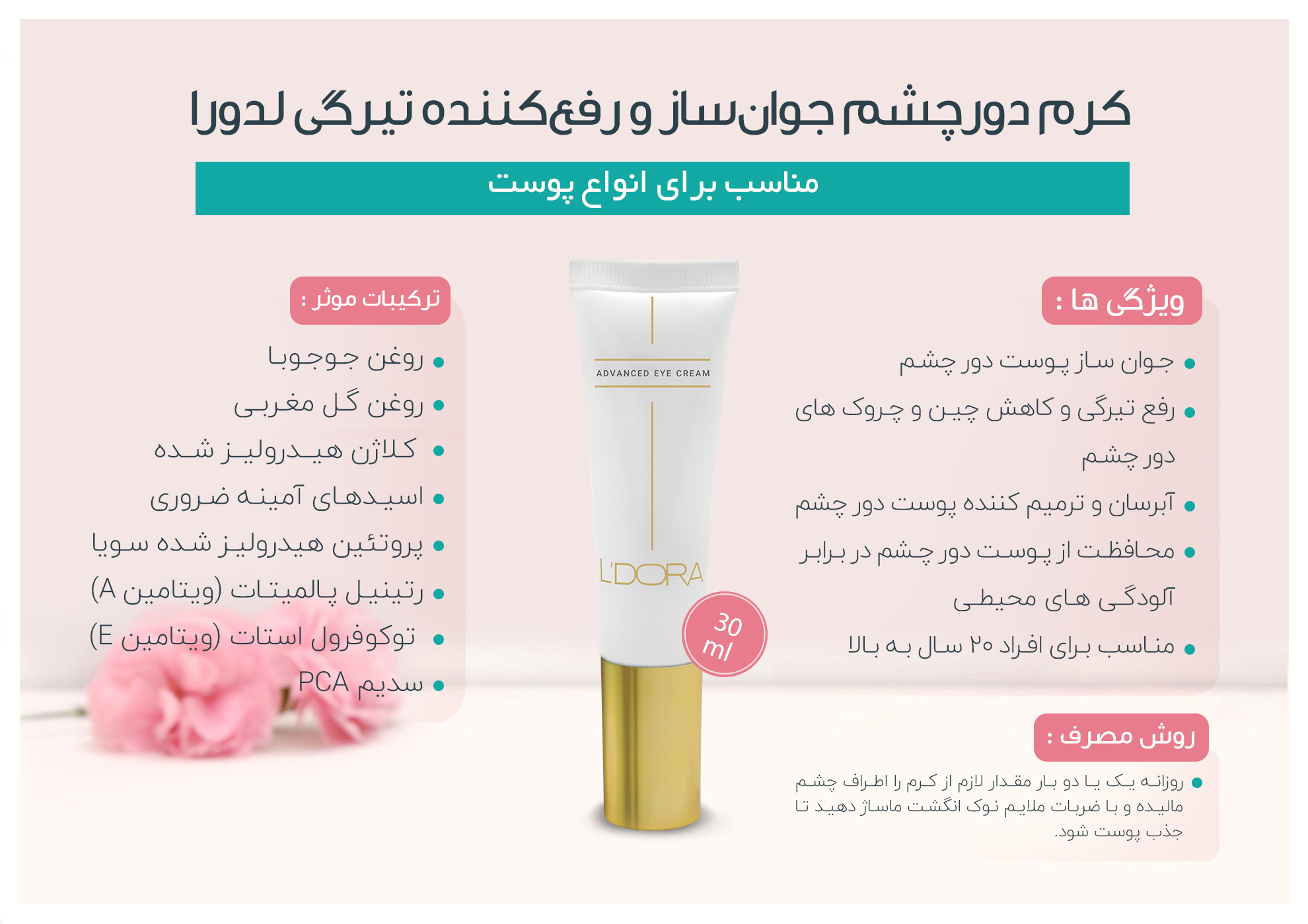 کرم دور چشم لدورا یک محصول کامل و بینظیر برای آبرسانی، ترمیم و محافظت دور چشم به شمار میرود: ۳۰ میل